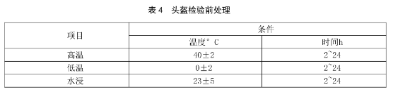 頭盔樣品必須按照表4規(guī)定處理后方可進(jìn)行檢驗,每頂頭盔樣品選—項處理。