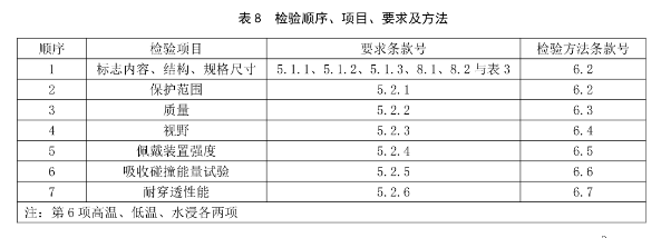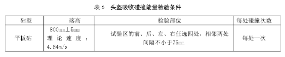 c)將經(jīng)過檢驗前處理的頭盔侃蛾于相應(yīng)的頭型上,系帶系緊,按表6檢驗條件進(jìn)行檢驗;d檢驗結(jié)果按5.2.5規(guī)定評定。