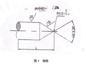 b)鋼錐:結(jié)構(gòu)和尺寸見圖4,材料為工具鋼(TIOA),質(zhì)量為3.0+0.5Kg,硬度不低于HRC50.圖中