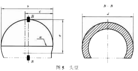 a)頭型:由近似人體頭部頻率響應的結構及金屬材料制成,頻率響應1400Hz以下平坦,最低共振頻率為2500Hz。頭型分小、中、大三個型號,見表6及圖5。墜落頭型的總質量(含傳感器及連接件)分別為小號40+0.1,中號50+0.1,大號60+0.1kg。其中,傳感器及連接件的質量不大于墜落頭型總質量的25%。