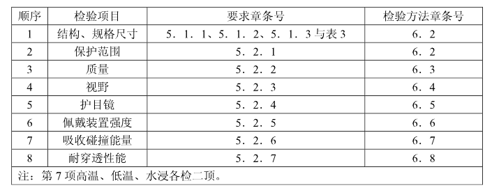 樣盔檢驗(yàn)順序、項(xiàng)目、要求及方法見(jiàn)表9。樣盔檢驗(yàn)分配,第1至6項(xiàng)和第8項(xiàng)每批抽取的6頂樣盔全檢,第8項(xiàng)在第7項(xiàng)檢驗(yàn)后進(jìn)行。